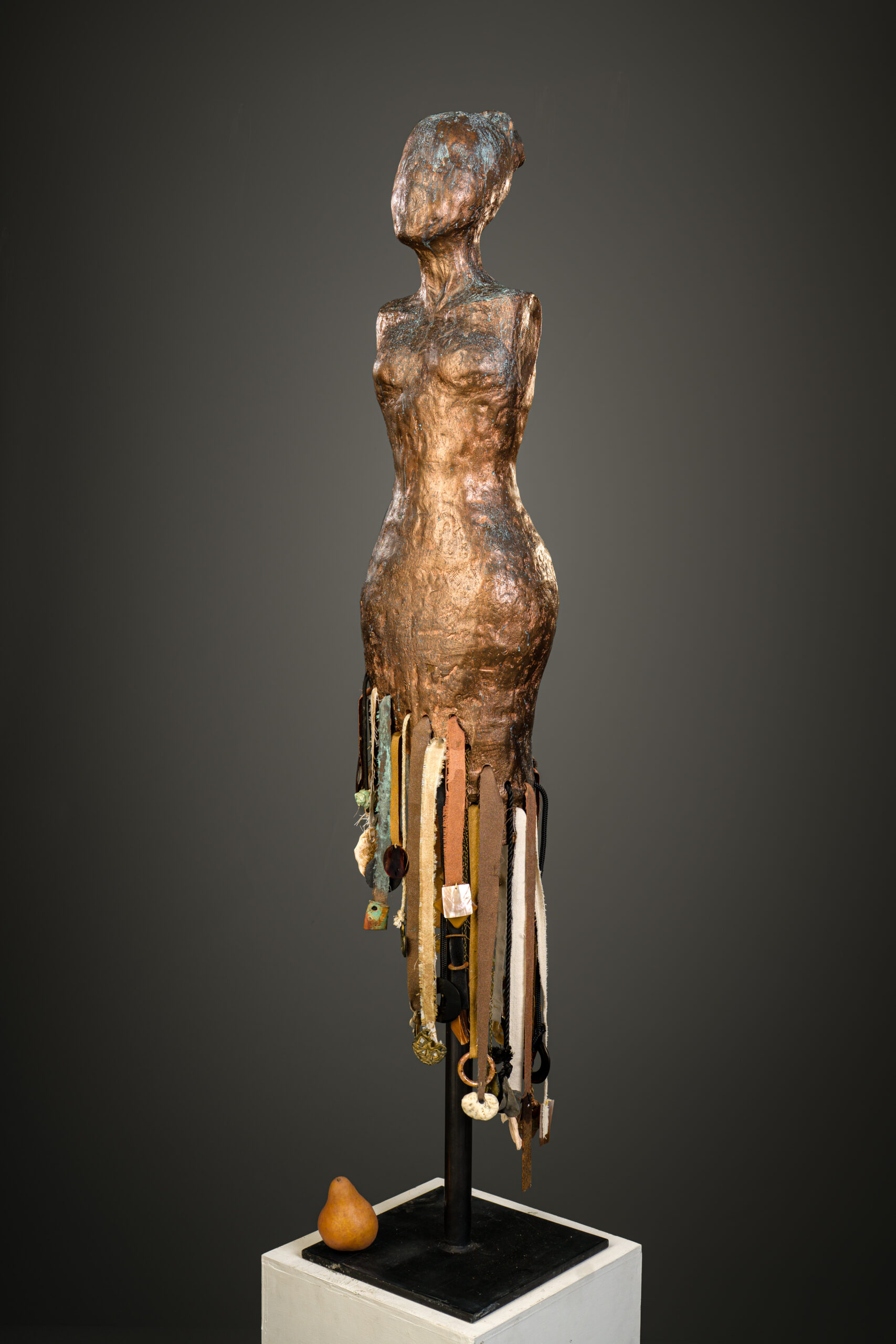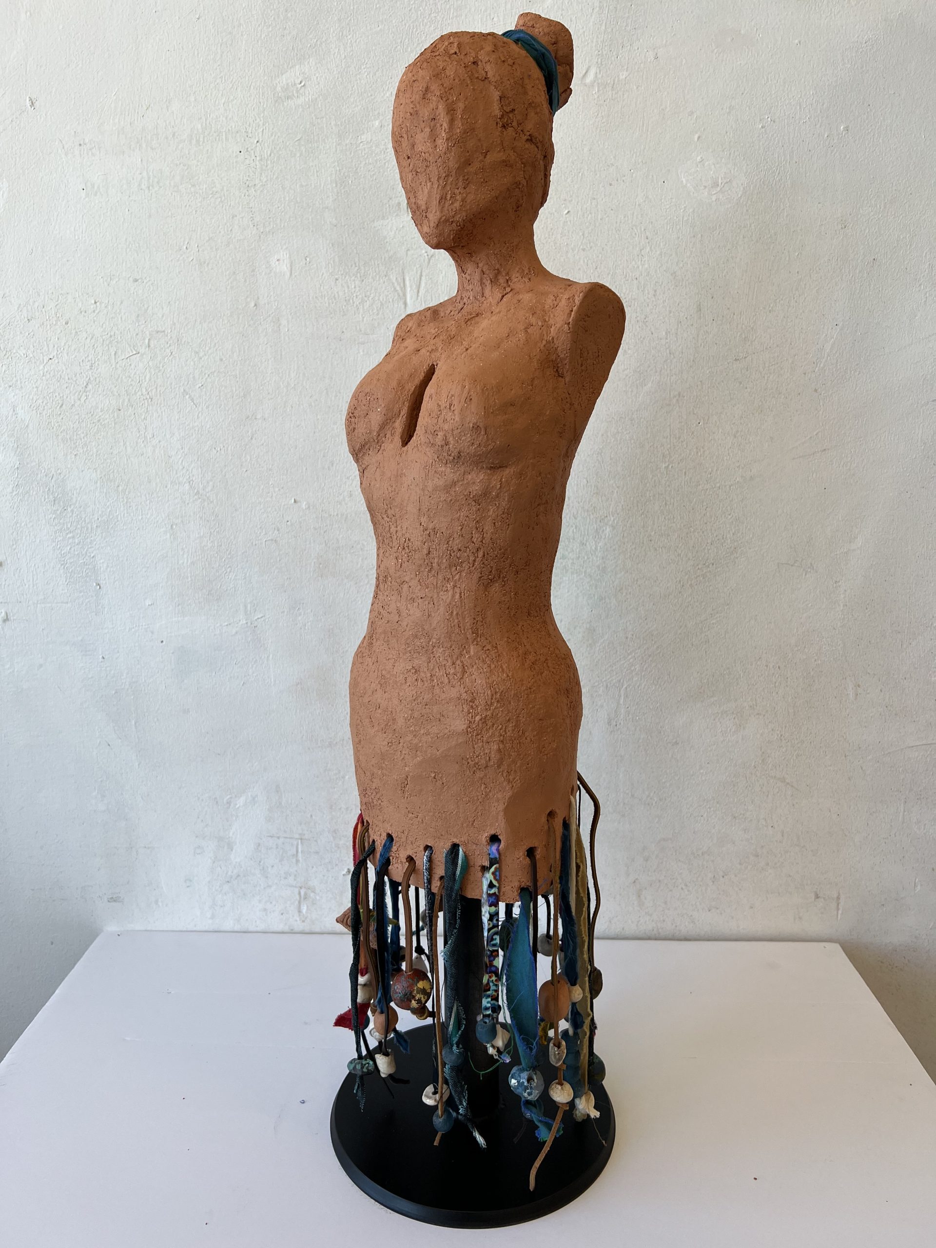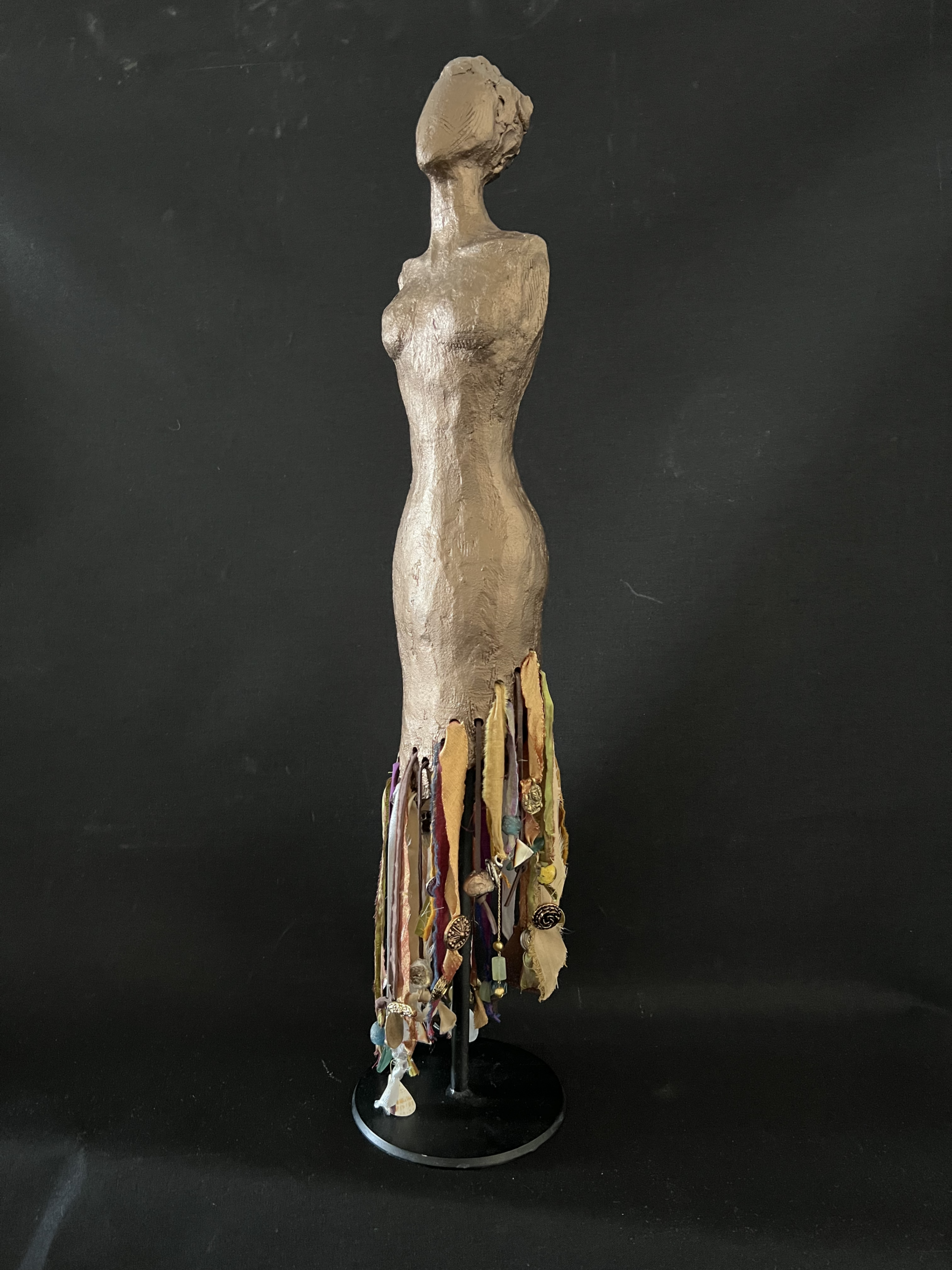 ceramic, fabric, metal, found objects 22″ high